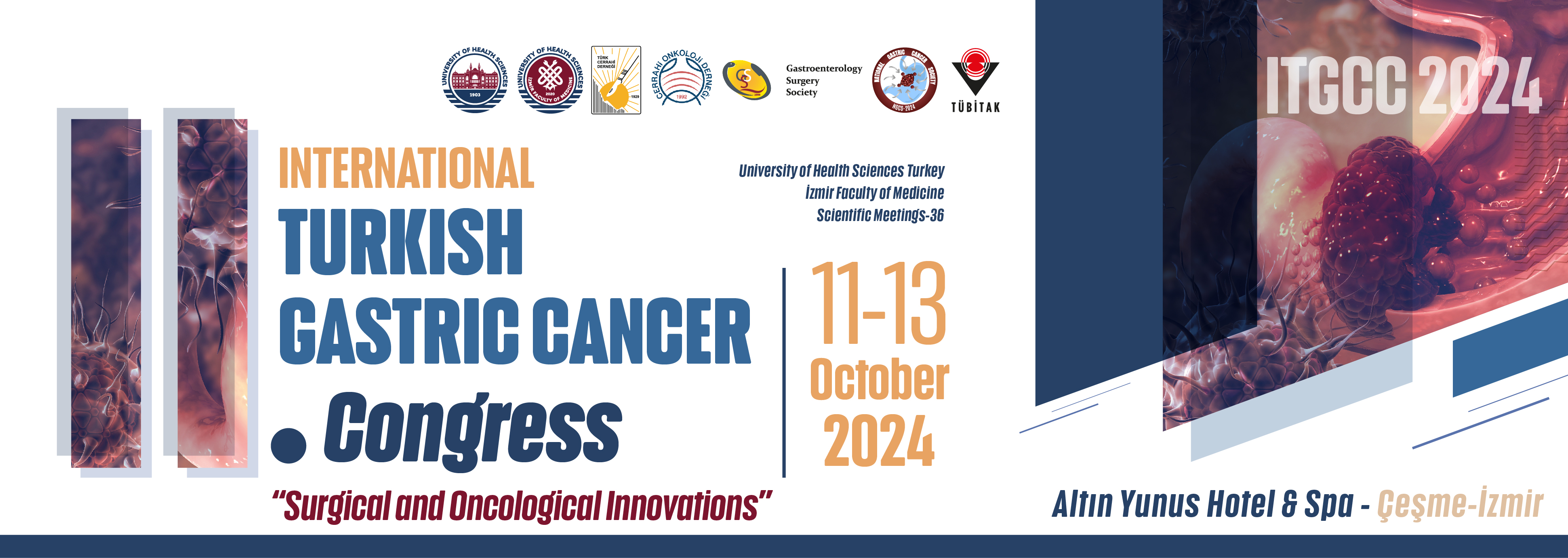 On October 11-13, 2024, in İzmir Çeşme, we will be holding themed ‘’Surgical and Oncological Innovations’’ the second international congress, which we traditionally plan to hold every two years. This conference will be organized in collaboration with the University of Health Sciences İzmir Faculty of Medicine, the Turkish Surgical Association, the Surgical Oncology Association, the Gastroenterology Surgery Society and the National Gastric Cancer Society. We are honored to have many famous national and international scientists attend our congress and share their knowledge and expertise. An interactive discussion will be held at the congress to provide insight into the latest studies and results in the field of gastric cancer, as well as the innovations brought about by modern technology. Moreover, our congress will feature highlight sessions, including "Being a Female Surgeon and Oncologist", "Hard/Interesting Cases'', "Discussions by Residents" and ‘’Cross Talk Opposing Views". Furthermore, "Palliative care for gastric cancer patients" and "Nursing care for gastric cancer patients" are significant subjects addressed at our congress. In the sessions, papers contributing to the scientific understanding of gastric cancer will be extensively discussed.